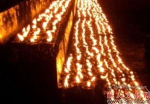 这天晚上,寺院和俗家屋顶均要点亮无数盏灯,在佛塔周围、殿堂屋顶、窗台、室内佛堂、佛龛、供桌等,凡能点灯的台阶上点一盏酥油供灯,佛堂内供一碗净水,把佛塔、殿宇、佛堂、屋子照得灯火通明,虔诚诵经,纪念宗喀巴大师。特别是那些依山而建的大寺,远远眺望,那一盏盏排成一字形或宝塔形供灯犹如繁星落地,把夜空照得通亮。