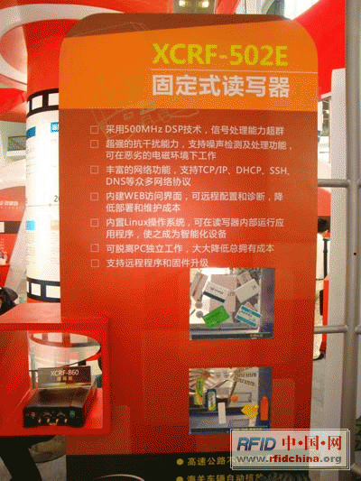 远望谷全面展示电子标签、读写器等系列产品,同时挂板上还以“十年远望 谷舞中国”为主题,全面展示公司应用解决方案,含括资产、医疗废物管理、集装箱管理、海关自动核放、汽车称重系统、物流周转托盘、畜牧业自动识别追溯系统等众多行业。