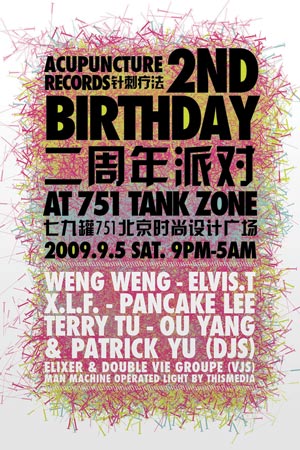 二周年庆典,08年“针刺疗法”一周年庆典“壹喜”的千人派对标志着“针刺疗法”厂牌从默默无闻到成长为国内首屈一指大厂牌的豪华庆典。随着“壹喜”之后成功举办的“SPOOKED 08”、“Genesis 09”的经典派对,以及中国首次大型露天电子音乐节“INTRO 2009”的成功举办,“针刺疗法”二周年庆典再次成为标志成长为国际知名厂牌的重要记录。2009年9月5日“针刺疗法”二周年庆典派对,工业园区七九罐夺目上演。七位个性DJ放送心醉节奏,多个VJ组合打造视觉迷宫,装置妙思将巨型圆罐变换为光色奇境。365天情绪一次性释放,新老好友再聚一堂,共温2年来与“针”共同走过的美好时光,这是你不可错过的狂欢节与纪念日。